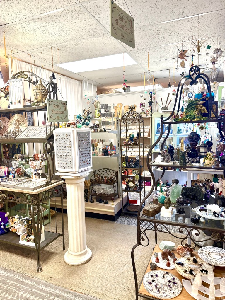 While Salty Shaman doesn’t have a full booth at the TrunkShow, we do have a shelf near the front counter that offers 55+ types of tumbled and rough gemstones, mystical earrings and rings, semiprecious bead bracelets, sage and incense.